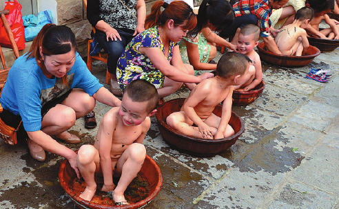 Young parents bathe their children in water with Ay Tsao to protect them from illness in Zigui, Hubei province, Qu Yuan's hometown.[Photo/China Daily]