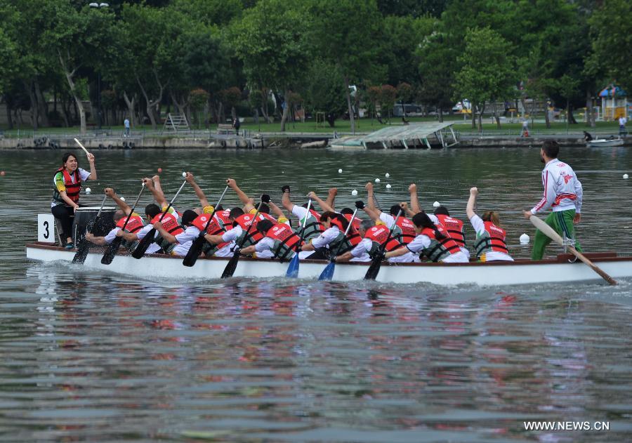 Competitors paddle in dragon boat race in Istanbul, on May 31, 2014. The 5th Dragon Boat Festival was held in Istanbul on Saturday. More than 5000 players from 220 dragon boat teams all over the country attended the festival. The annual event was held around the Dragon Boat Festival, a Chinese traditional festival, attracting thousands of spectators. (Xinhua/Lu Zhe)