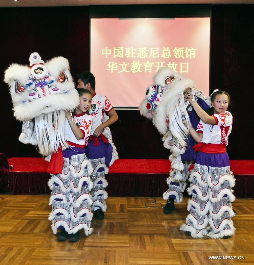 Students of local Chinese language schools perform dragon dance during the "Open Day Event of Chinese Language Education" at the Chinese consulate general in Sydney, Australia, June 1, 2014. Teachers and students of local Chinese language schools were invited to the event in celebration of International Children's Day. (Xinhua/Jin Linpeng)