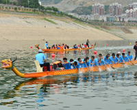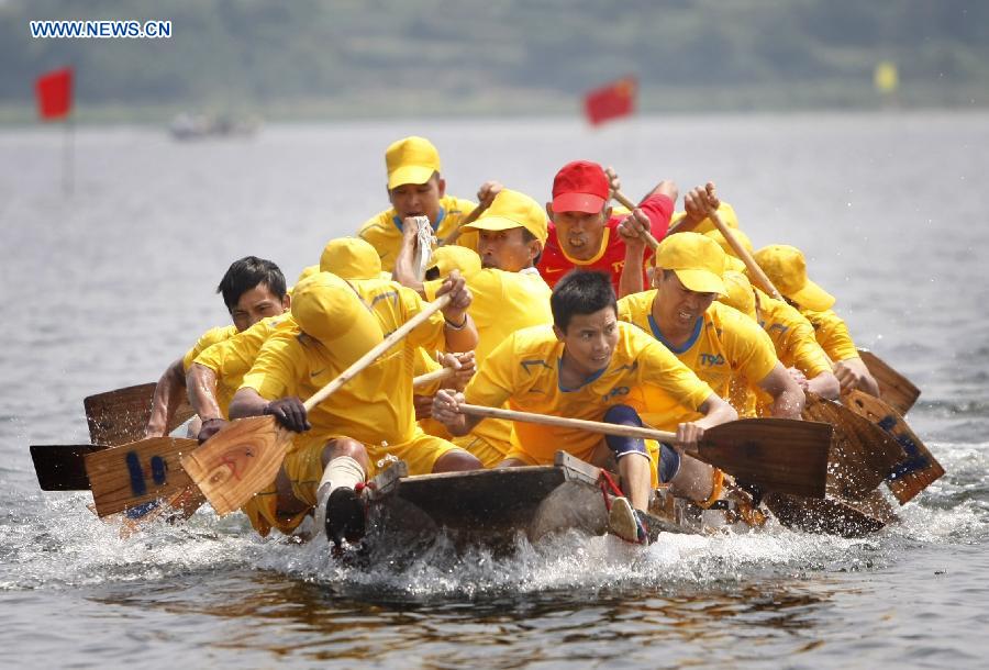 Competitors row on a boat during a race held to celebrate the Dragon Boat Festival in Chengzi Town of Jiujiang, east China's Jiangxi Province, June 2, 2014. The Dragon Boat Festival, also known as Duanwu, is celebrated annually on the fifth day of the fifth month of the Chinese lunar calendar, which falls on June 2 this year. (Xinhua/Gu Weidong)