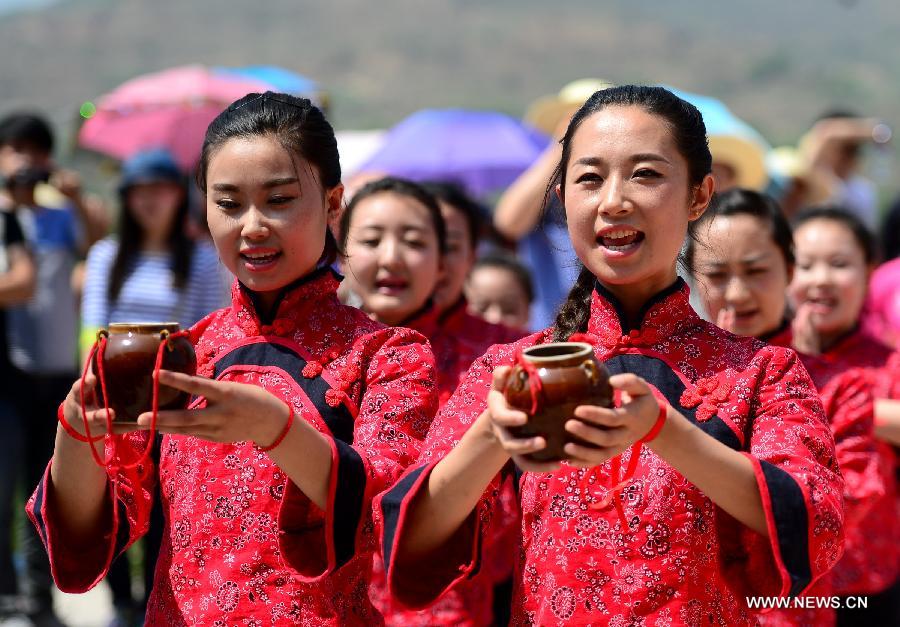 Actresses perform a dance adapted from the folk story "Qiqiao" during the Qiqiao Culture Festival in Xihe County of Longnan City, northwest China's Gansu Province, June 1, 2014. Girls here have a tradition to pray for good luck from "Qiao Goddess" during the Qiqiao Festival. (Xinhua/Zhang Meng)