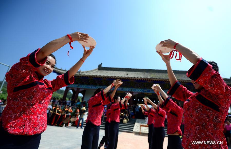 Actresses perform a dance adapted from the folk story "Qiqiao" during the Qiqiao Culture Festival in Xihe County of Longnan City, northwest China's Gansu Province, June 1, 2014. Girls here have a tradition to pray for good luck from "Qiao Goddess" during the Qiqiao Festival. (Xinhua/Zhang Meng)