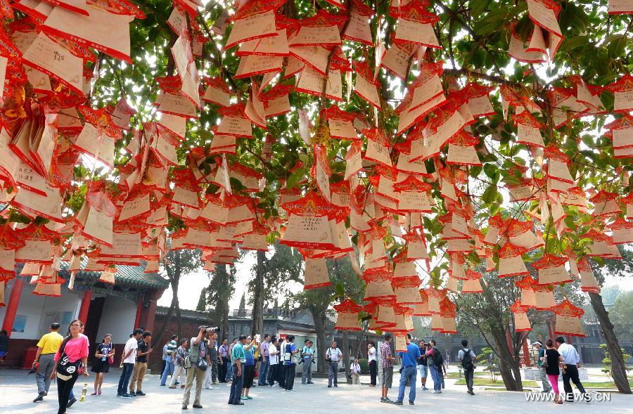 Tourists visit Guanlin Temple, which was built to commemorate Guan Yu, a general of the Three Kingdom period (220-280 AD) known for his loyalty and righteousness, in Luoyang, central China's Henan Province, Sept. 19, 2013. Luoyang, one of the cradles of Chinese civilization and one of the "Four Great Ancient Capitals of China", tries to integrate its tourism spots, an effort to build a "Chinese Culture City."(Xinhua/Wang Song)