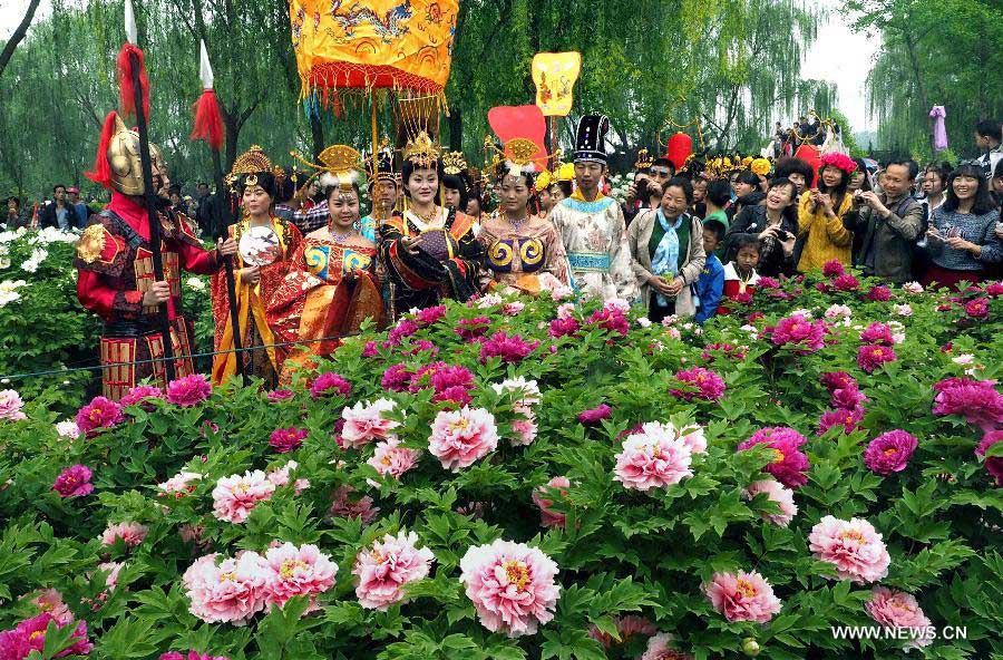 Actress acting as the Empress Wu watches peony at China National Flower Park in Luoyang, central China's Henan Province, April 6, 2014. Luoyang, one of the cradles of Chinese civilization and one of the "Four Great Ancient Capitals of China", tries to integrate its tourism spots, an effort to build a "Chinese Culture City."(Xinhua/Wang Song)