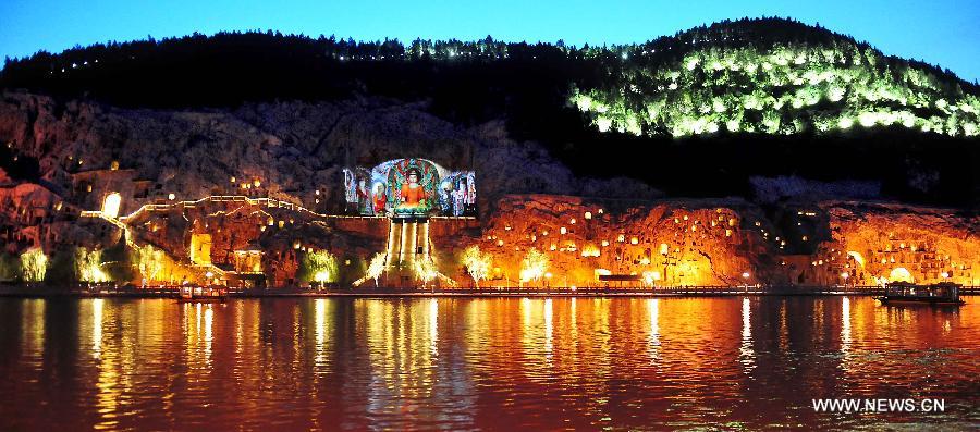Night view is seen at the Longmen Grottoes in Luoyang, central China's Henan Province, April 13, 2012. Luoyang, one of the cradles of Chinese civilization and one of the "Four Great Ancient Capitals of China", tries to integrate its tourism spots, an effort to build a "Chinese Culture City."(Xinhua/Wang Song)