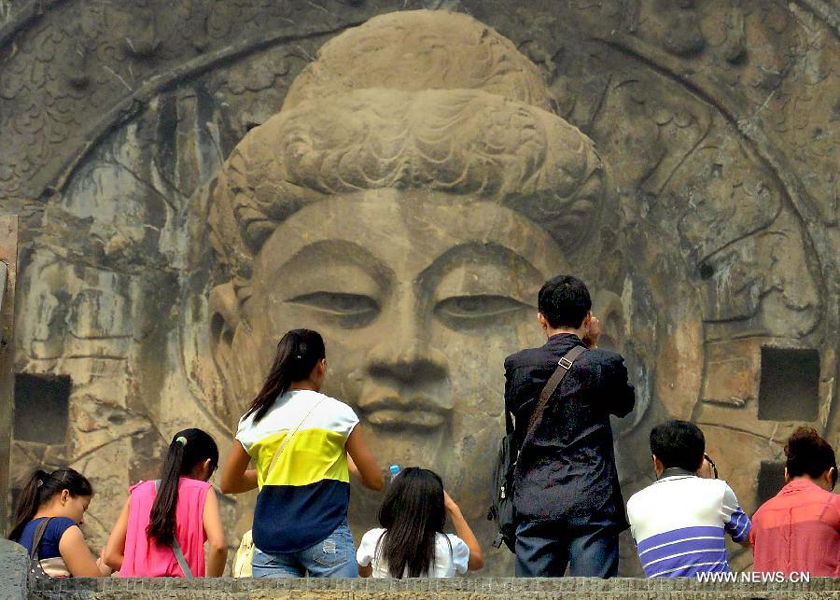 Tourists visit the Longmen Grottoes in Luoyang, central China's Henan Province, Sept. 19, 2013. Luoyang, one of the cradles of Chinese civilization and one of the "Four Great Ancient Capitals of China", tries to integrate its tourism spots, an effort to build a "Chinese Culture City."(Xinhua/Wang Song)