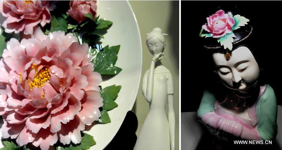 Combination photo taken on Sept. 19, 2013 shows porcelains depicting peony culture at Luoyang Peony Porcelain Museum in Luoyang, central China's Henan Province. Luoyang, one of the cradles of Chinese civilization and one of the "Four Great Ancient Capitals of China", tries to integrate its tourism spots, an effort to build a "Chinese Culture City."(Xinhua/Wang Song)