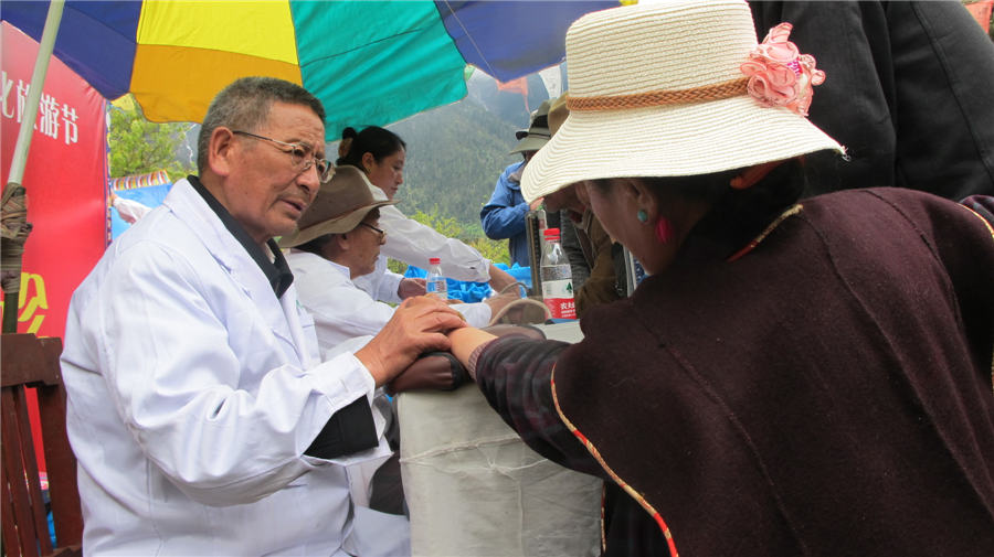 Professional doctors from the Manzikhang – the regional Tibetan medical hospital and astrology institute, provided free medical care for local patients. [Photo by Palden Nyima/for China Daily]
