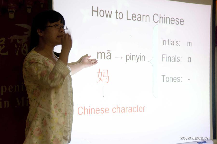 A teacher from the Confucius Institute teaches Chinese to the staffs of Ministry of Foreign Affairs during the opening ceremony of Basic Chinese Class at Ministry of Foreign Affairs in Kathmandu, Nepal, June 9, 2014. The Basic Chinese Class was organized by Embassy of China to Nepal and Confucius Institute of Kathmandu University. (Xinhua/Pratap Thapa)