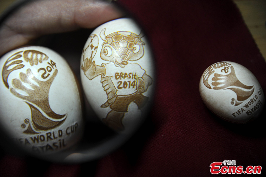 An eggshell carving master from Hefei, Anhui province shows his carving handicrafts featuring patterns of Fuleco, the official mascot of the 2014 FIFA World Cup Brazil, and the emblem of the sporting event on June 9, 2014. The 2014 FIFA World Cup will start with the opening ceremony on June 12 and last until the final on July 13. [Photo: China News Service /Han Suyuan]