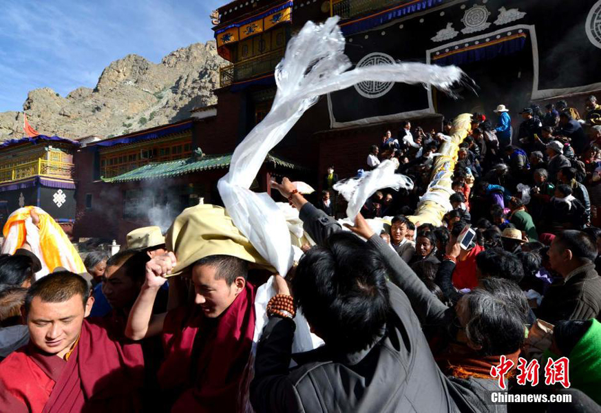 On June 10, with the sound of sutra bugle, lamas and many Buddhists carried on the large-scale Padmasambhava Thangka or Thanka Paintings to the platform for the exhibition of the Buddha. The grand ceremony not only attracted many local Buddhists, but also many pilgrims from China and abroad. Tsurpu Monastery is the ancestral temple of Karma Kagyu sect of Tibetan Buddhism and has nearly one thousand years of history. (CNS Photo)