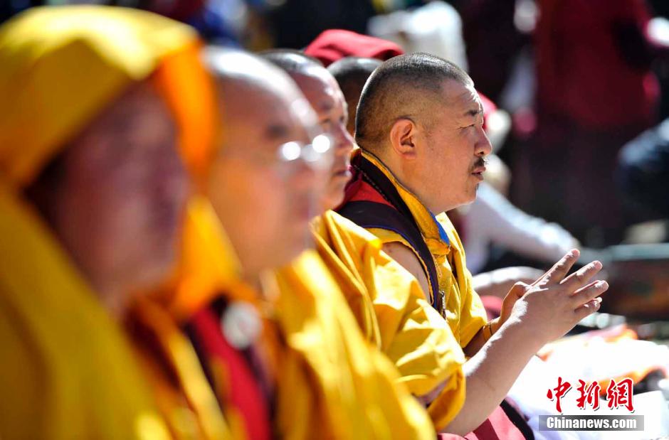 On June 10, with the sound of sutra bugle, lamas and many Buddhists carried on the large-scale Padmasambhava Thangka or Thanka Paintings to the platform for the exhibition of the Buddha. The grand ceremony not only attracted many local Buddhists, but also many pilgrims from China and abroad. Tsurpu Monastery is the ancestral temple of Karma Kagyu sect of Tibetan Buddhism and has nearly one thousand years of history. (CNS Photo)