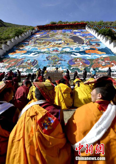On June 10, with the sound of sutra bugle, lamas and many Buddhists carried on the large-scale Padmasambhava Thangka or Thanka Paintings to the platform for the exhibition of the Buddha. The grand ceremony not only attracted many local Buddhists, but also many pilgrims from China and abroad. Tsurpu Monastery is the ancestral temple of Karma Kagyu sect of Tibetan Buddhism and has nearly one thousand years of history. (CNS Photo)
