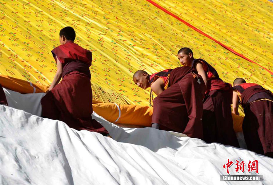 On June 10, with the sound of sutra bugle, lamas and many Buddhists carried on the large-scale Padmasambhava Thangka or Thanka Paintings to the platform for the exhibition of the Buddha. The grand ceremony not only attracted many local Buddhists, but also many pilgrims from China and abroad. Tsurpu Monastery is the ancestral temple of Karma Kagyu sect of Tibetan Buddhism and has nearly one thousand years of history. (CNS Photo)
