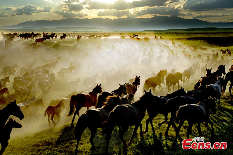 Ili horses run on the grassland at Zhaosu county of Ili Kazakh autonomous prefecture in northwest China's Xinjiang Uygur autonomous region. The county is well-known for its quality breed of Ili horses. [Photo/Dang Wenting]