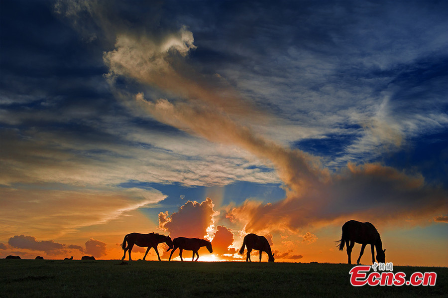 Photo shows sunset scenery of Zhaosu county of Ili Kazakh Autonomous Prefecture in northwest China's Xinjiang Uygur autonomous region. The county is well-known for its quality breed of Ili horses. [Photo/Dang Wenting]