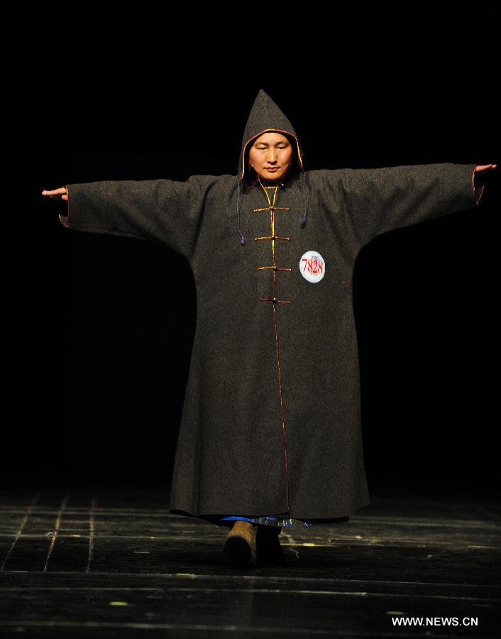 A model presents a creation during the National Costume Festival of Mongolia in Hulun Buir, north China's Inner Mongolia autonomous region, June 14, 2014. Mongolian folk costumes mostly develop from court and nomadic life. They are embroidered and woven in bright colors, often with exquisite tiaras and belts. [Xinhua/Shao Kun]