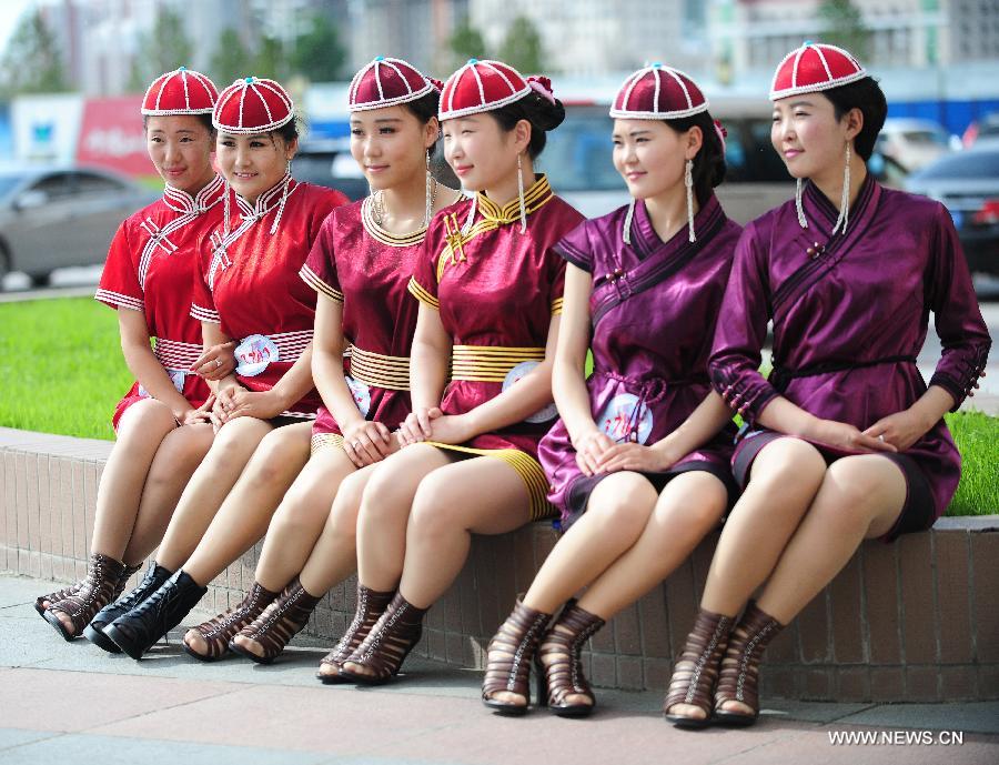 Models wait to present creations during the National Costume Festival of Mongolia in Hulun Buir, north China's Inner Mongolia autonomous region, June 14, 2014. Mongolian folk costumes mostly develop from court and nomadic life. They are embroidered and woven in bright colors, often with exquisite tiaras and belts. [Xinhua/Shao Kun]
