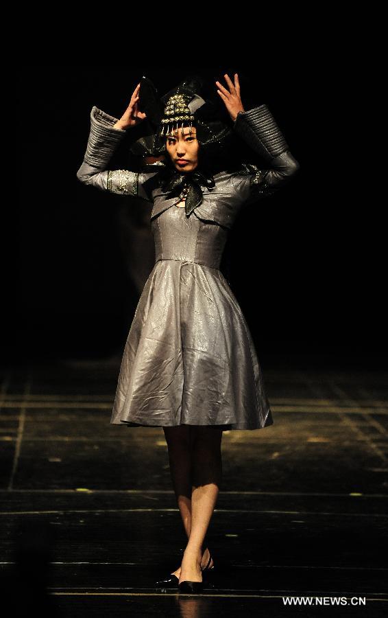 A model presents a creation during the National Costume Festival of Mongolia in Hulun Buir, north China's Inner Mongolia autonomous region, June 14, 2014. Mongolian folk costumes mostly develop from court and nomadic life. They are embroidered and woven in bright colors, often with exquisite tiaras and belts. [Xinhua/Shao Kun]