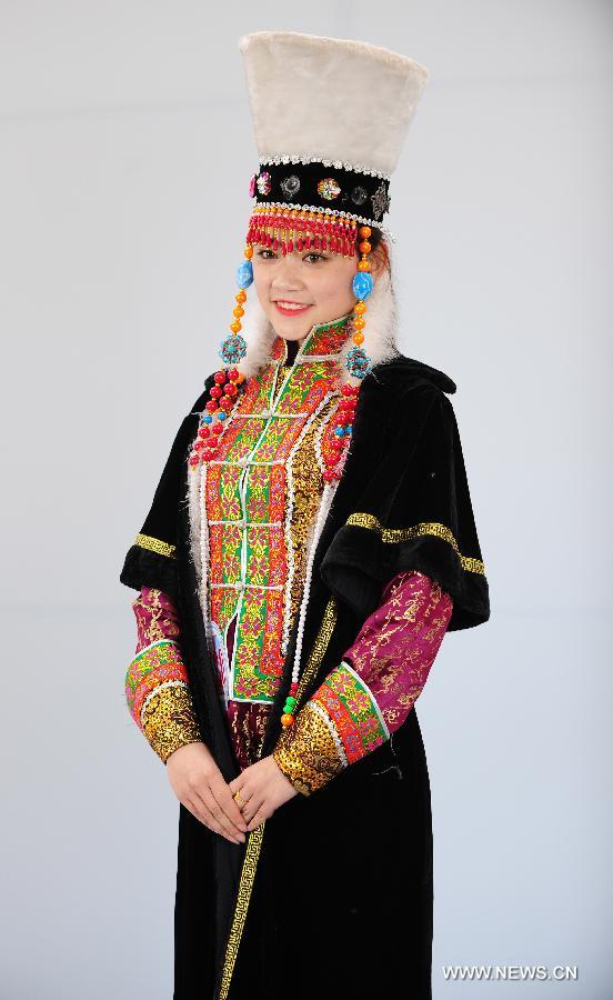 A model presents a creation during the National Costume Festival of Mongolia in Hulun Buir, north China's Inner Mongolia autonomous region, June 14, 2014. Mongolian folk costumes mostly develop from court and nomadic life. They are embroidered and woven in bright colors, often with exquisite tiaras and belts. [Xinhua/Shao Kun]