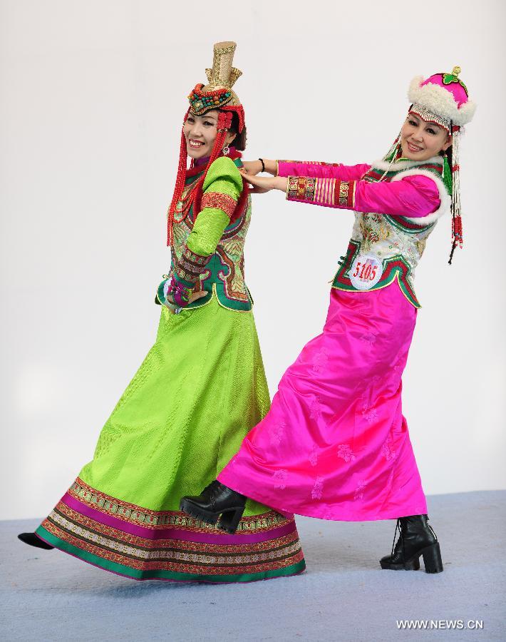 Models present creations during the National Costume Festival of Mongolia in Hulun Buir, north China's Inner Mongolia autonomous region, June 14, 2014. Mongolian folk costumes mostly develop from court and nomadic life. They are embroidered and woven in bright colors, often with exquisite tiaras and belts. [Xinhua/Shao Kun]