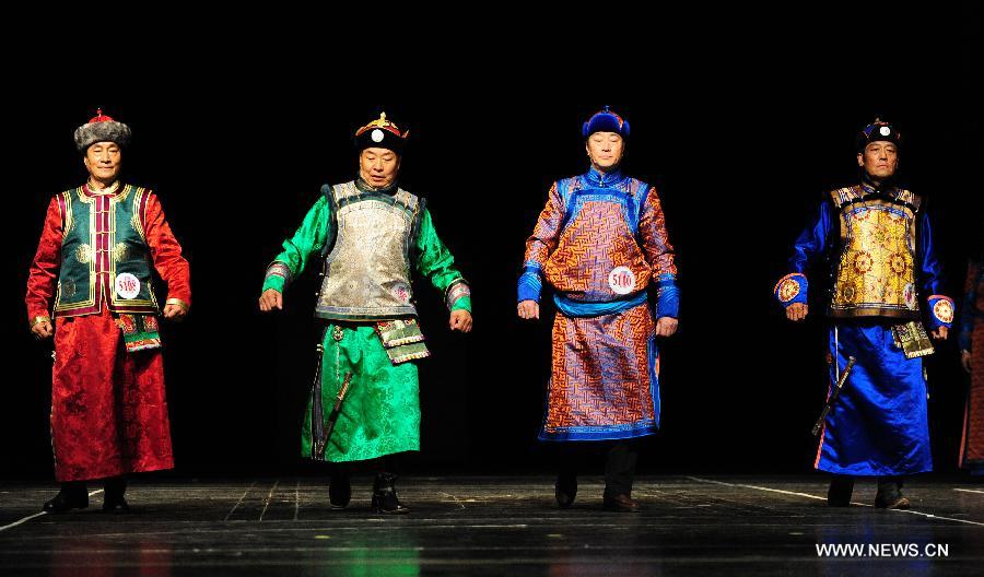 Models present creations during the National Costume Festival of Mongolia in Hulun Buir, north China's Inner Mongolia autonomous region, June 14, 2014. Mongolian folk costumes mostly develop from court and nomadic life. They are embroidered and woven in bright colors, often with exquisite tiaras and belts. [Xinhua/Shao Kun]