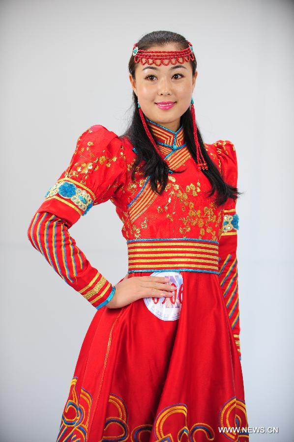 A model presents a creation during the National Costume Festival of Mongolia in Hulun Buir, north China's Inner Mongolia autonomous region, June 14, 2014. Mongolian folk costumes mostly develop from court and nomadic life. They are embroidered and woven in bright colors, often with exquisite tiaras and belts. [Xinhua/Shao Kun]