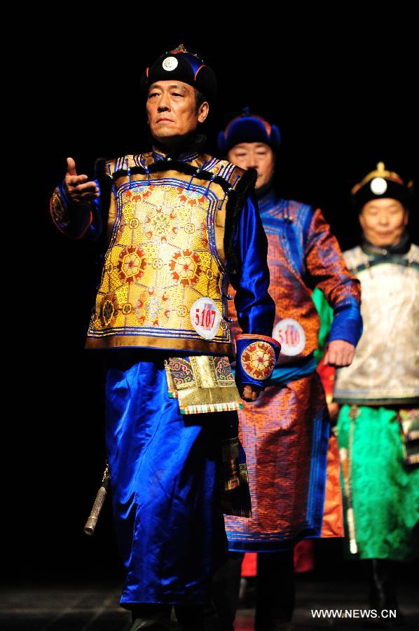 Models present creations during the National Costume Festival of Mongolia in Hulun Buir, north China's Inner Mongolia autonomous region, June 14, 2014. Mongolian folk costumes mostly develop from court and nomadic life. They are embroidered and woven in bright colors, often with exquisite tiaras and belts. [Xinhua/Shao Kun]