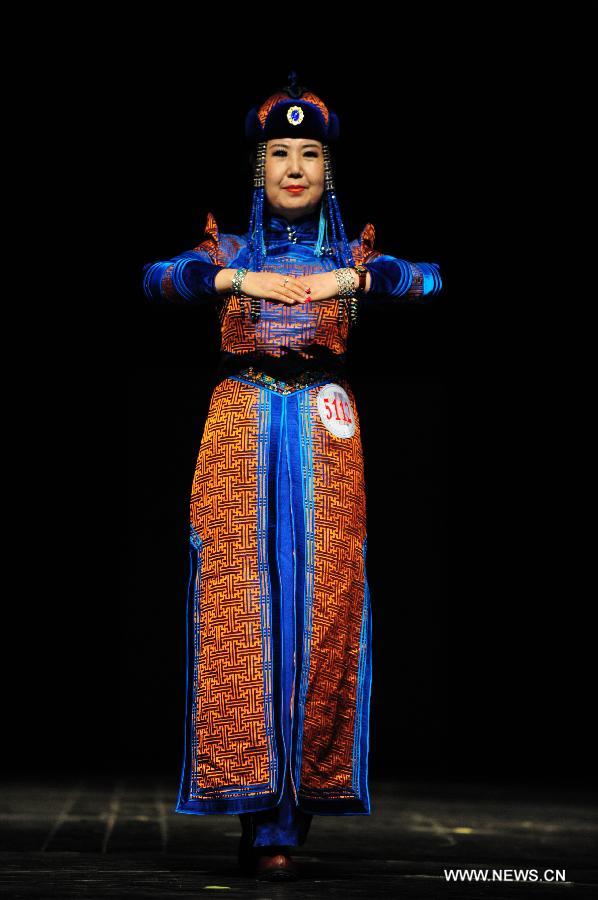 A model presents a creation during the National Costume Festival of Mongolia in Hulun Buir, north China's Inner Mongolia autonomous region, June 14, 2014. Mongolian folk costumes mostly develop from court and nomadic life. They are embroidered and woven in bright colors, often with exquisite tiaras and belts. [Xinhua/Shao Kun]