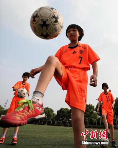 Girls practice basic football skills in Shanghai Xingta primary school. (CNS/ Zhuang Yi)