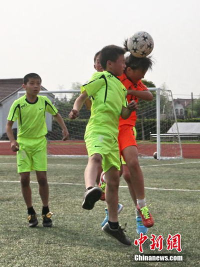 Girls practice basic football skills in Shanghai Xingta primary school. (CNS/ Zhuang Yi)