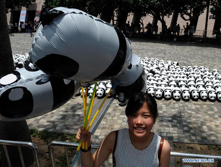 A girl poses for a photo in front of paper pandas during an exhibition in Tsim Sha Tsui, south China's Hong Kong, June 14, 2014. A total of 1,600 paper pandas were displayed here Saturday, which were the work of French artist Paulo Grangeon. (Xinhua/Lo Ping Fai)