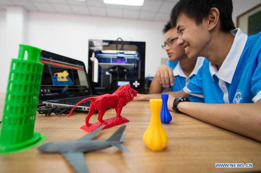 Students operate a 3D printer at the 3D LAB in Beijing No. 2 Middle School Yizhuang School, in Beijing, capital of China, June 16, 2014. A total of 10 DM Cube desktop 3D printers were donated to this school Monday. (Xinhua/Zhang Yu)