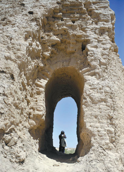 The castle has been stripped of all adornment, pillaged throughout many dynasties, leaving only the adobe walls. This is also the area to see mirages and streamlined hills carved from bedrock by wind abrasion.