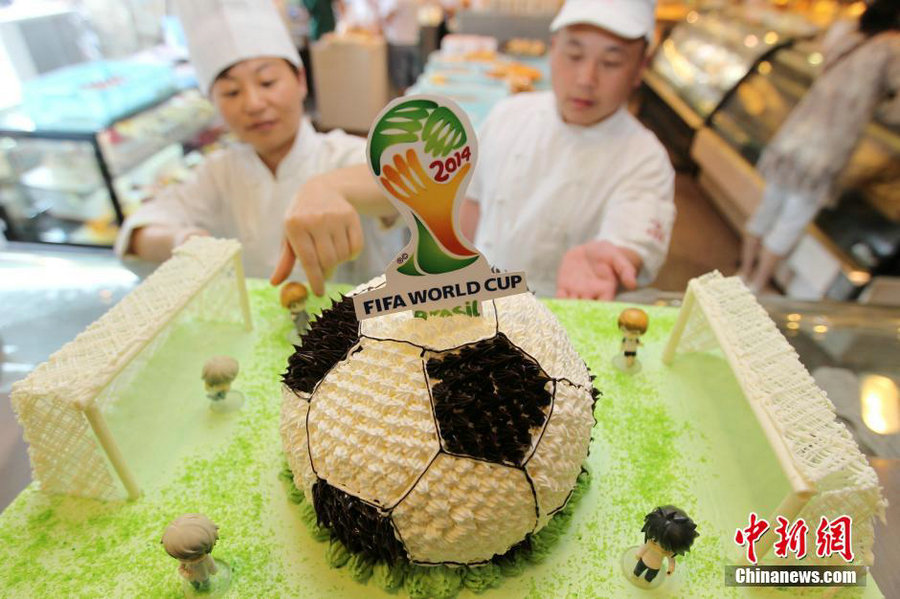 Cakes with the theme of the World Cup Football were sold at a store in east China's Jiangsu province. (China News Service/Xu Congjun)