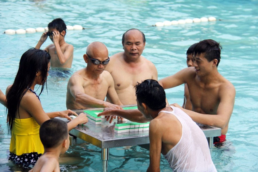 Check out these residents in Foshan City, citizens are playing mahjong in a swimming pool.
