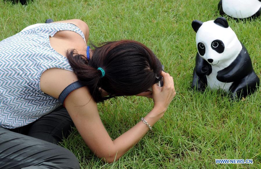A journalist takes photo of a paper panda displayed during an exhibition at the Victoria Park, south China's Hong Kong, June 19, 2014. A total of 1,600 paper pandas were displayed here on June 19, which were the work of French artist Paulo Grangeon. (Xinhua/Lo Ping Fai)