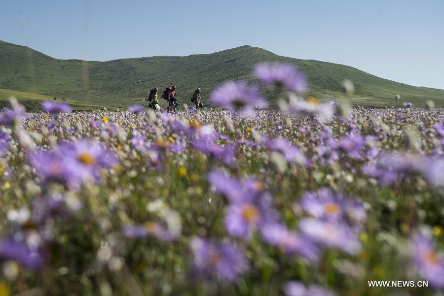Tourists walk among flowers on the Emutang Pasture in Rangkou Township of Hongyuan County, southwest China's Sichuan Province, June 19, 2014. (Xinhua/Jiang Hongjing)