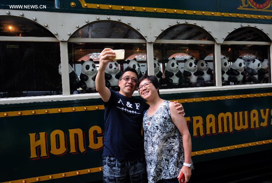 Residents pose for photos with paper pandas which travel on a tram in Hong Kong, south China, June 20, 2014. A total of 1,600 paper pandas, the work of French artist Paulo Grangeon, were displayed in Hong Kong. (Xinhua/Lo Ping Fai)