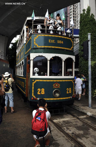 Paper pandas travel on a tram in Hong Kong, south China, June 20, 2014. A total of 1,600 paper pandas, the work of French artist Paulo Grangeon, were displayed in Hong Kong. (Xinhua/Lo Ping Fai)