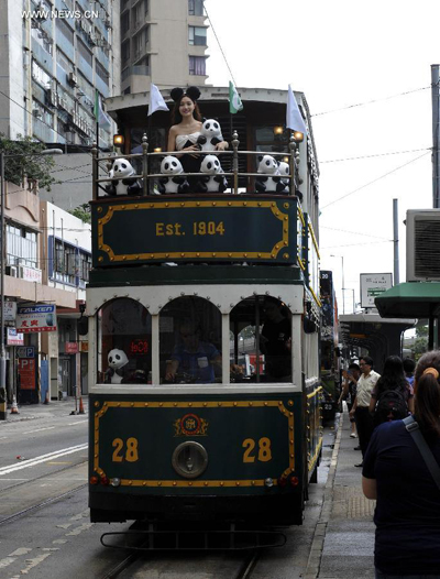 Paper pandas travel on a tram in Hong Kong, south China, June 20, 2014. A total of 1,600 paper pandas, the work of French artist Paulo Grangeon, were displayed in Hong Kong. (Xinhua/Lo Ping Fai)