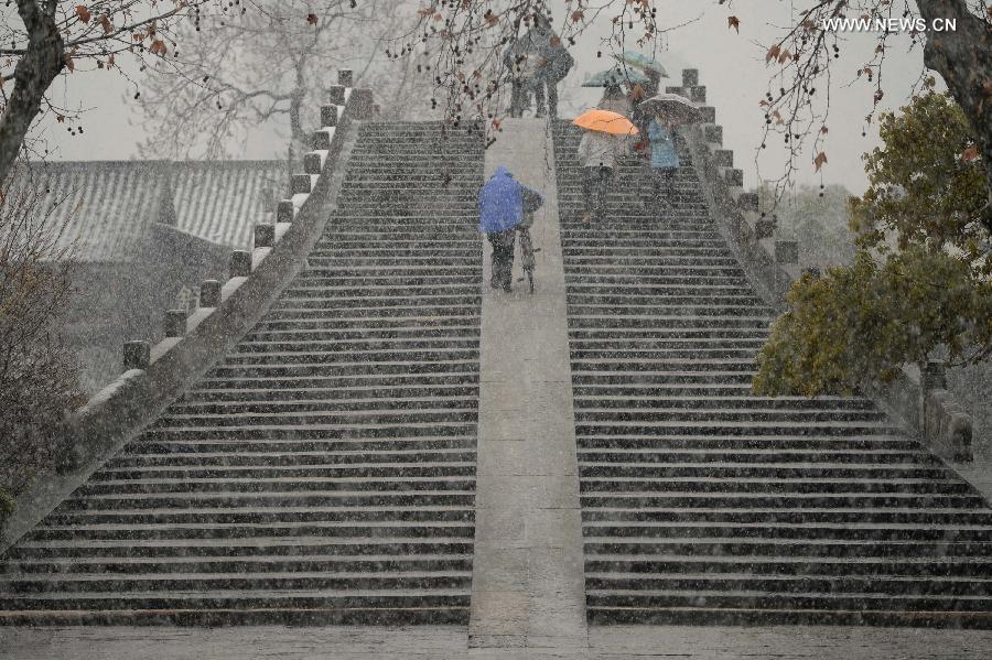 Photo taken on Feb. 18, 2014 shows people walking on the Gongchen Bridge across the Hangzhou section of China's Grand Canal, east China's Zhejiang Province. China's Grand Canal, the longest artificial waterway in the world, was inscribed on the World Heritage list on June 22, 2014. The Grand Canal with a history of more than 2,400 years was recognized by UNESCO World Heritage Committee which convened its 38th session in the Qatari capital. The 1,794-km canal runs from Beijing to Hangzhou in China's eastern Zhejiang Province. (Xinhua)
