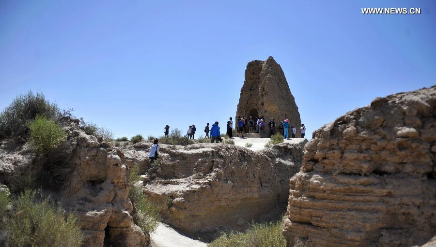 Photo taken on July 22, 2013 shows people visiting the ruins of Suoyang City in Guazhou County, northwest China's Gansu Province. Suoyang, which dates back to the Han Dynasty (202 BC-220 AD), was an ancient city on the Silk Road. The famous ancient Silk Road, which served as a corridor for trade and cultural exchanges between Asia and Europe dating back to 2,000 years ago, was inscribed on the World Heritage list at Doha, capital of Qatar on June 22, 2014. Jointly submitted by China, Kazakhstan and Kyrgyzstan, the application for adding part of the millennium-old trade route to the UNESCO list was approved by the World Heritage Committee which convened its 38th session in Doha. (Xinhua)