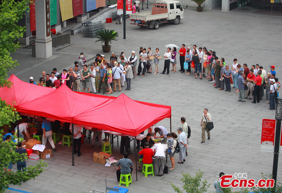 People in Hangzhou, Zhejiang province wait in a queue to buy the limited edition stamps and envelopes featuring paintings of China’s Grand Canal on June 23, 2014. The postal products are issued to celebrate the canal’s winning of world heritage status granted by the UNESCO on June 22, 2014. [Photo: China News Service/ Li Chenyun]