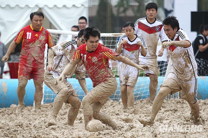 The 2014 mud football world cup is held in Beijing, which attracts 300 competitors. The champion team may have the chance to participate in the finals in Britain. (Qianlong/Qi Lianmin)