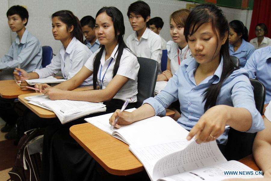 Cambodian students learn Chinese language at Asia Euro University in Phnom Penh, Cambodia, June 20, 2014. More and more Cambodian students search degrees in Chinese literature as Cambodian- Chinese ties in economics, trade, investment, and tourism have been expanding rapidly in recent years.[Photo/Xinhua]