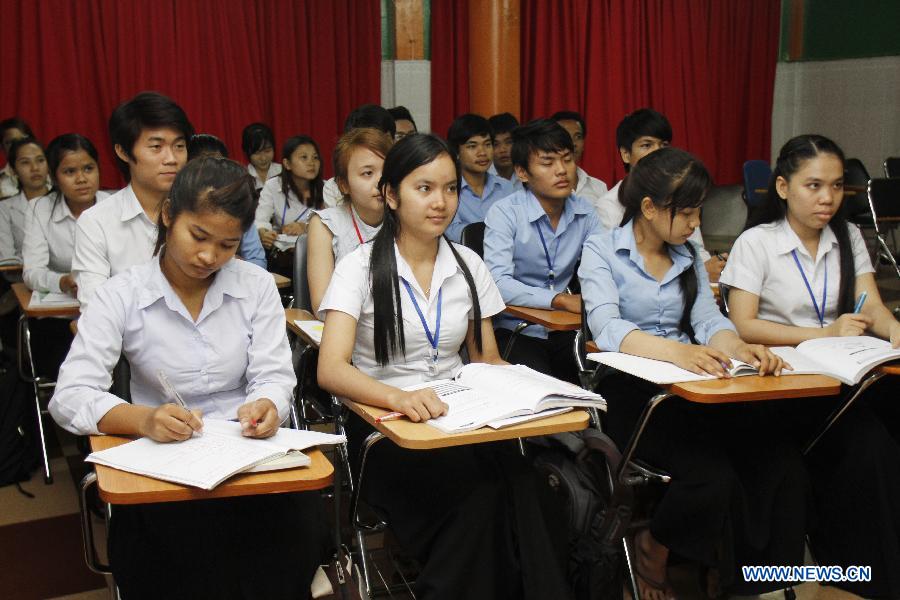 Cambodian students learn Chinese language at Asia Euro University in Phnom Penh, Cambodia, June 20, 2014. More and more Cambodian students search degrees in Chinese literature as Cambodian- Chinese ties in economics, trade, investment, and tourism have been expanding rapidly in recent years. [Photo/Xinhua]