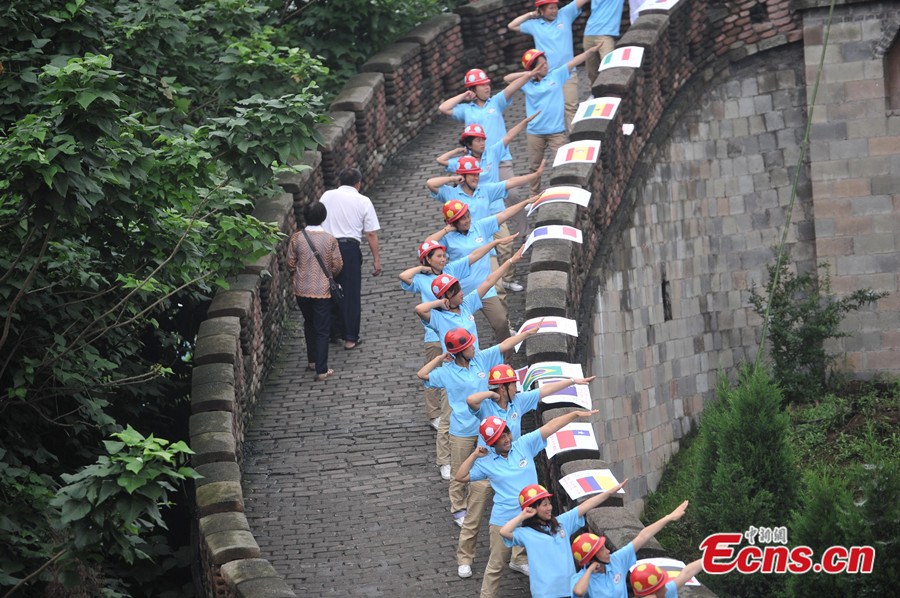 Work staff, from Yangren Jie of southwest China's Chongqing municipality, participates in a flash mob to cheer for ongoing FIFA World Cup on June 25, 2014. [Photo/Chen Chao]