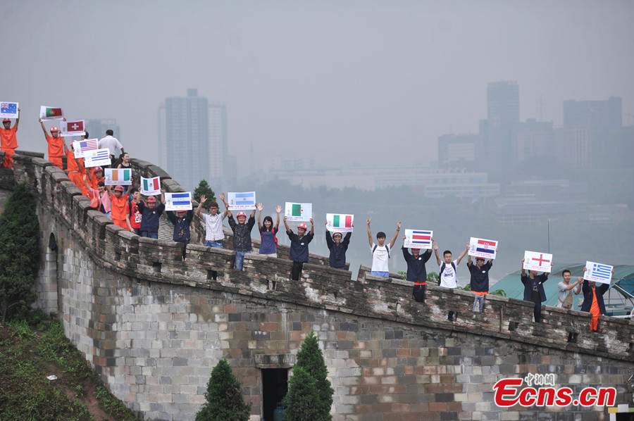 Work staff, from Yangren Jie of southwest China's Chongqing municipality, participates in a flash mob to cheer for ongoing FIFA World Cup on June 25, 2014. [Photo/Chen Chao]