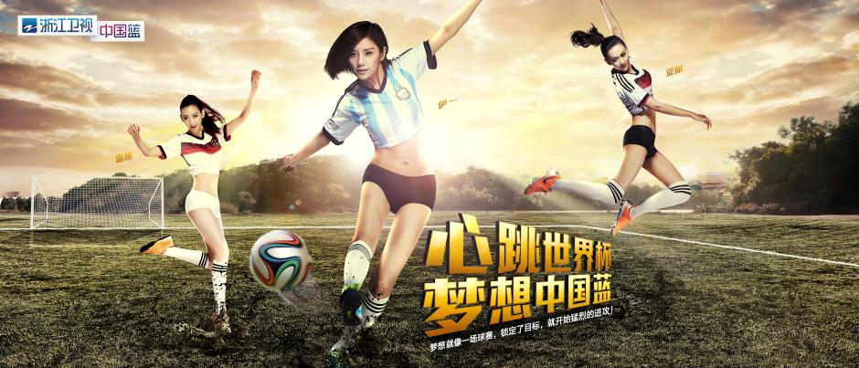 The female reporters from Zhejiang TV dress up in soccer uniforms of the national teams participating in the Brazil FIFA World Cup and pose for photos to celebrate the global soccer tournament. (Photo/CNS)